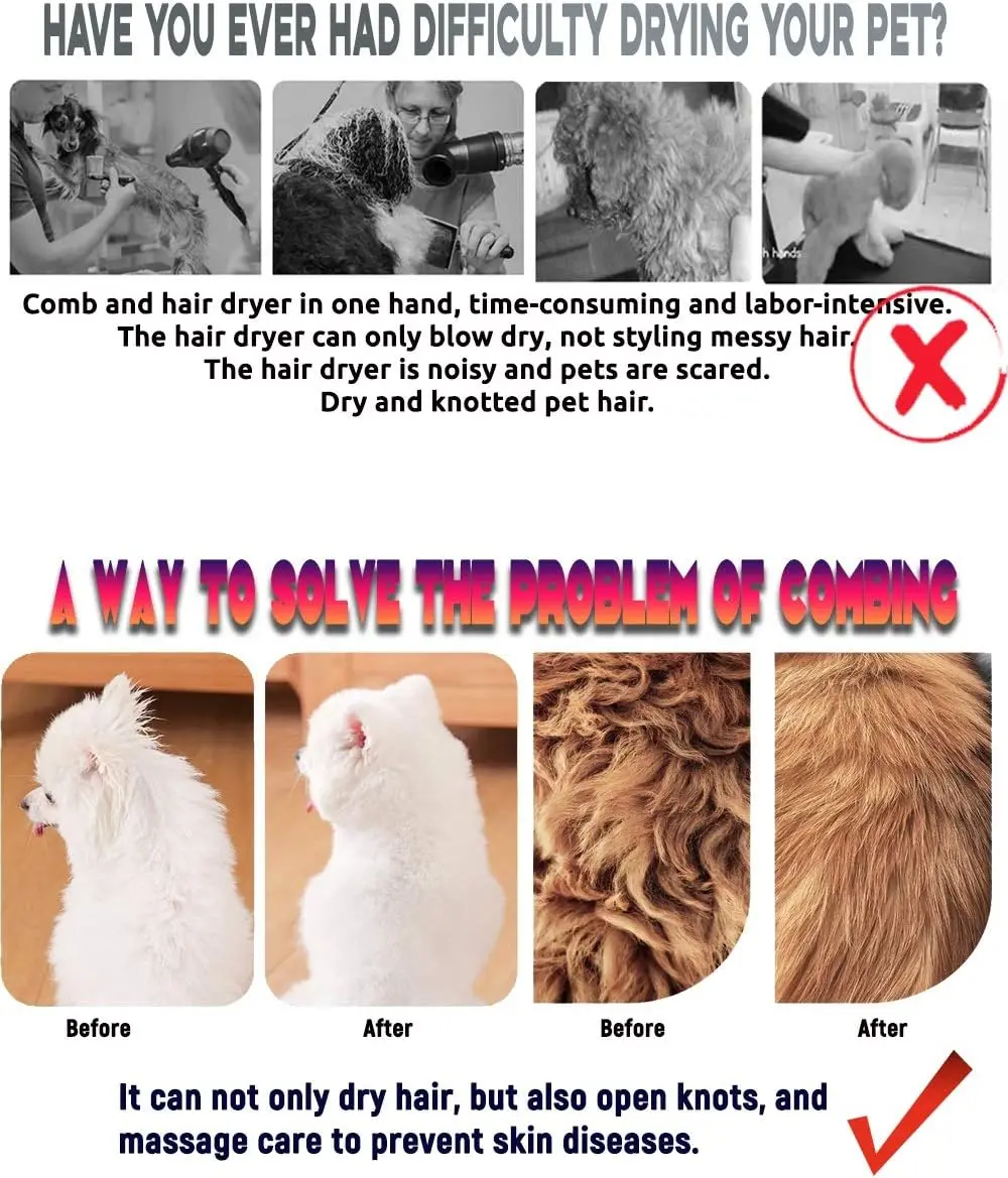 Are you having trouble grooming your dog?Are you annoyance when your dog shower or have a rainy walking your dog splashed you out of the bath? our dog grooming dryer is specially designed for these issue, 2-IN-1 pet hair dryer can easily remover extra fur of dog and cat, matted hair and tangles from your pet's coat while drying simultaneously. Combine pet hair dryer with hair brush for the pet grooming brush,to keep pet's hair soft and neat.more convenient and time saving.